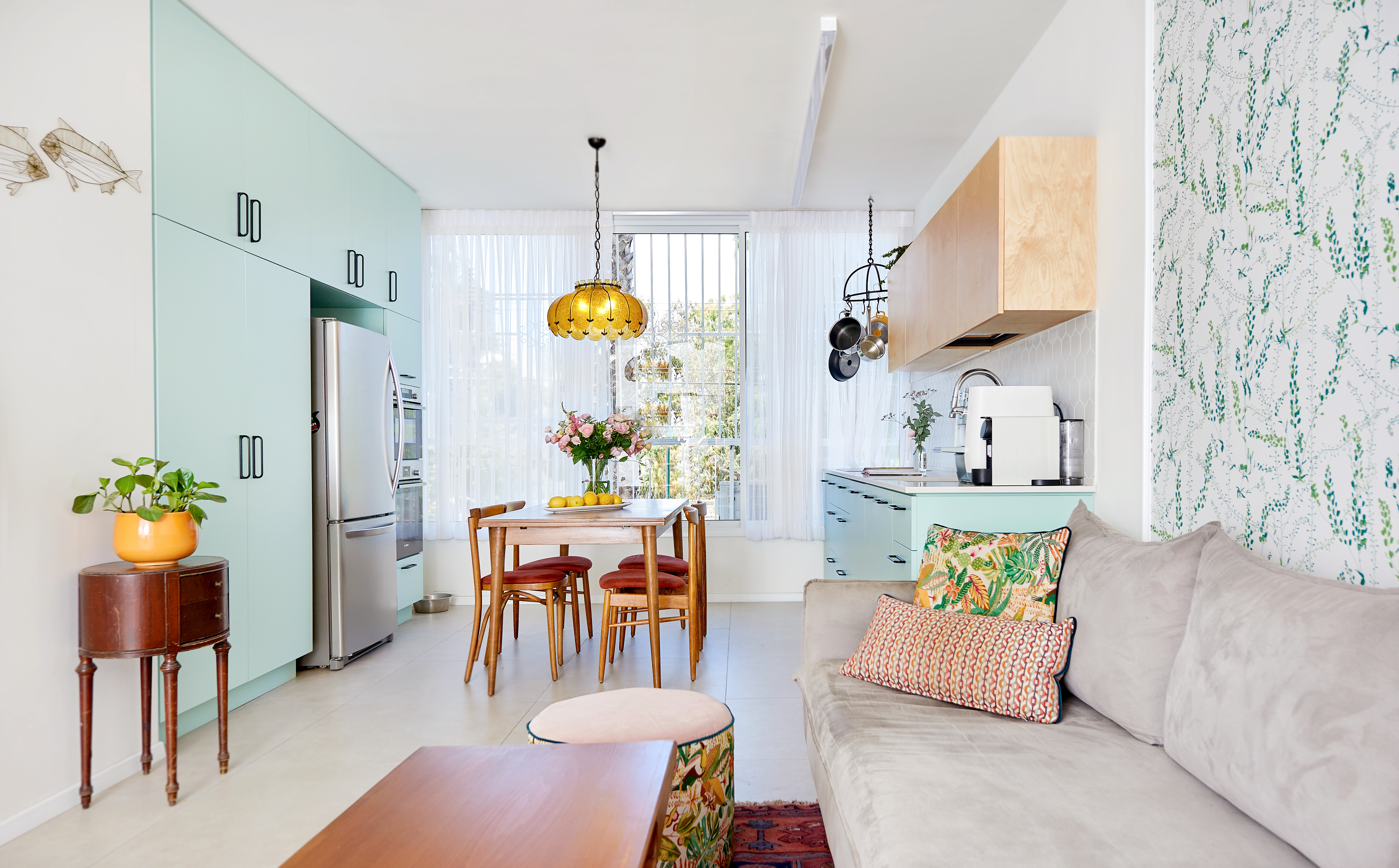 This project was a collaboration with my studio’s lead interior designer, Noa Bar, and it serves as a case study in the importance of smart planning and prioritization. The family purchased a modest 700-square-foot apartment for themselves, their two daughters, and their dog. During our second meeting at the studio, as we always do, we asked them to create a "dream list" for the home and rank their priorities. Amazingly, we were able to fulfill every wish—from creating space to host 20 people for dinner, to carving out a private "stargazing" corner in the parents' small suite under a green window, to finding clever storage solutions and designing flexible, modular spaces that provide privacy when needed. The process was filled with excitement, unexpected life events, and a deep sense of gratitude. The end result is exhilarating, as there’s nothing quite like seeing an apartment fully realize its potential.